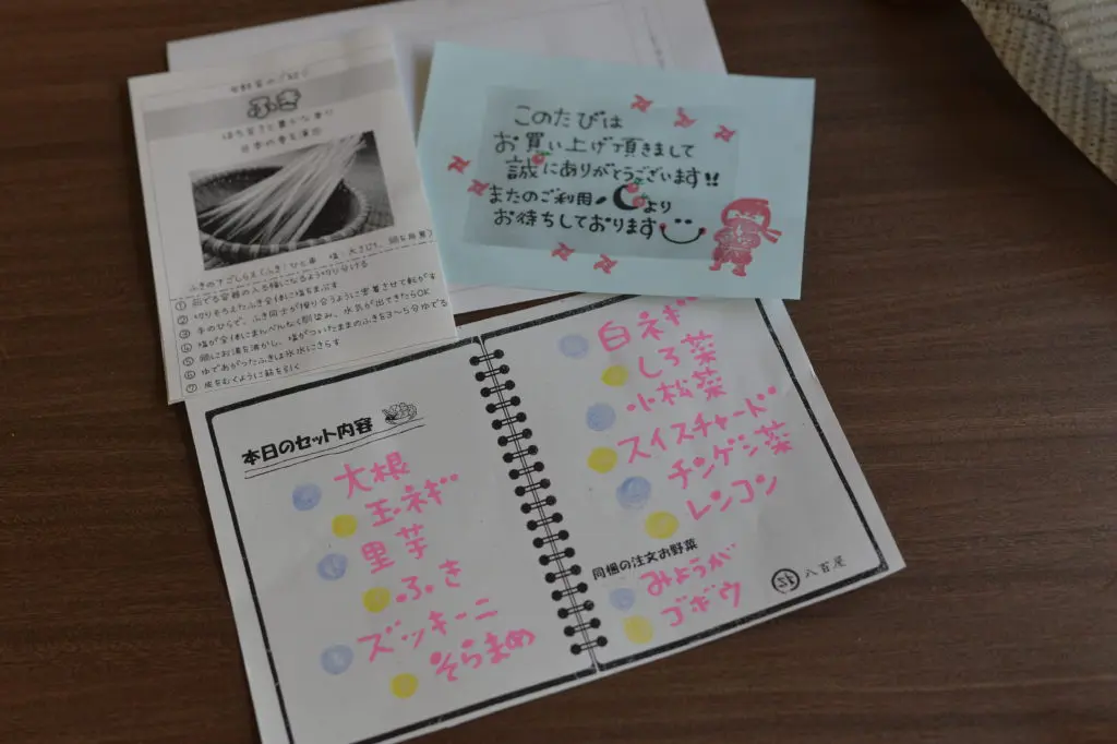 下の紙のように、可愛らしい文字で内容物をメモしてくれてあります。