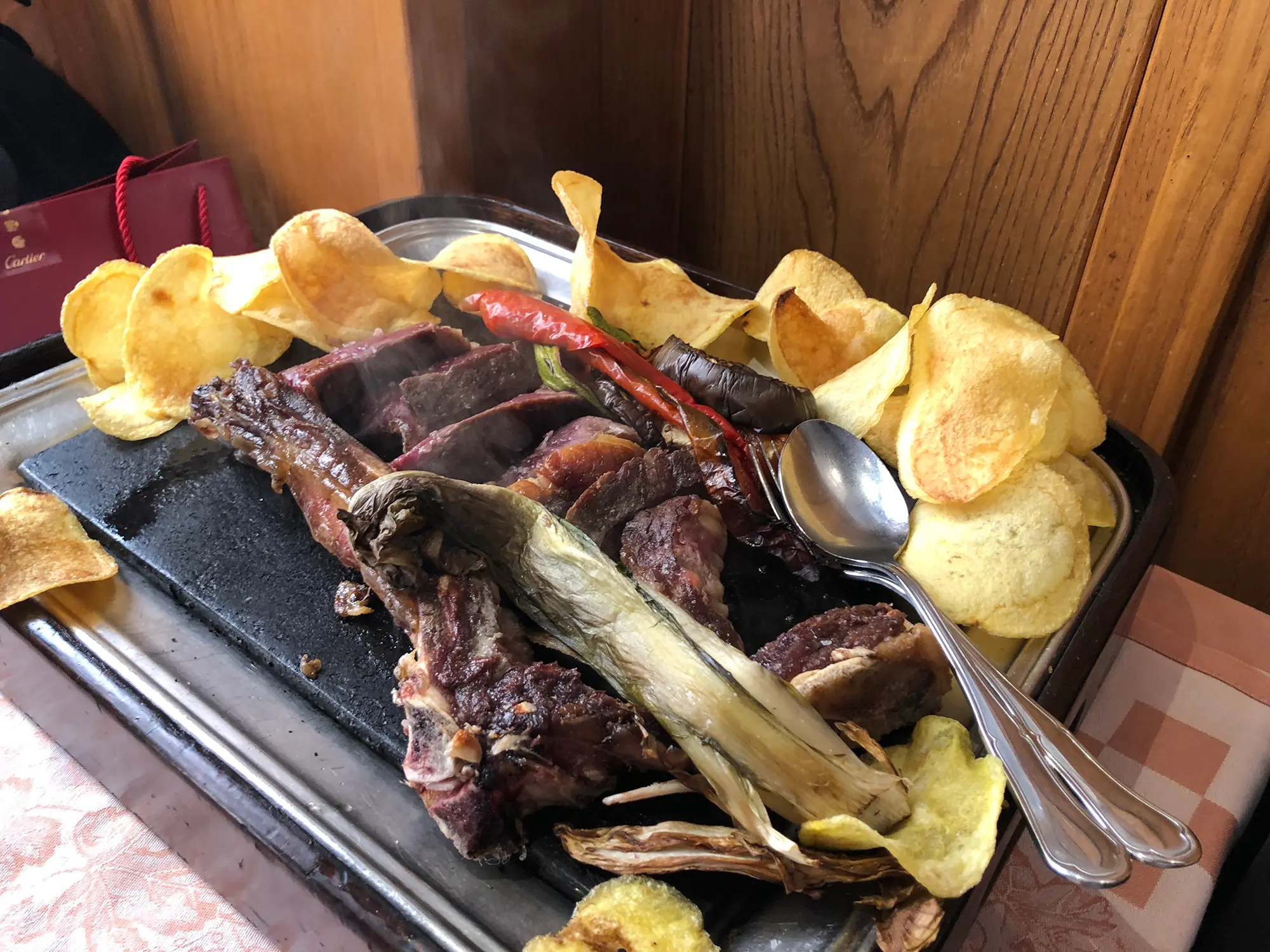 この店の名物?のTボーンステーキです。鉄板の上で焼いたままのステーキに、保温させるためにチップスが覆われています。