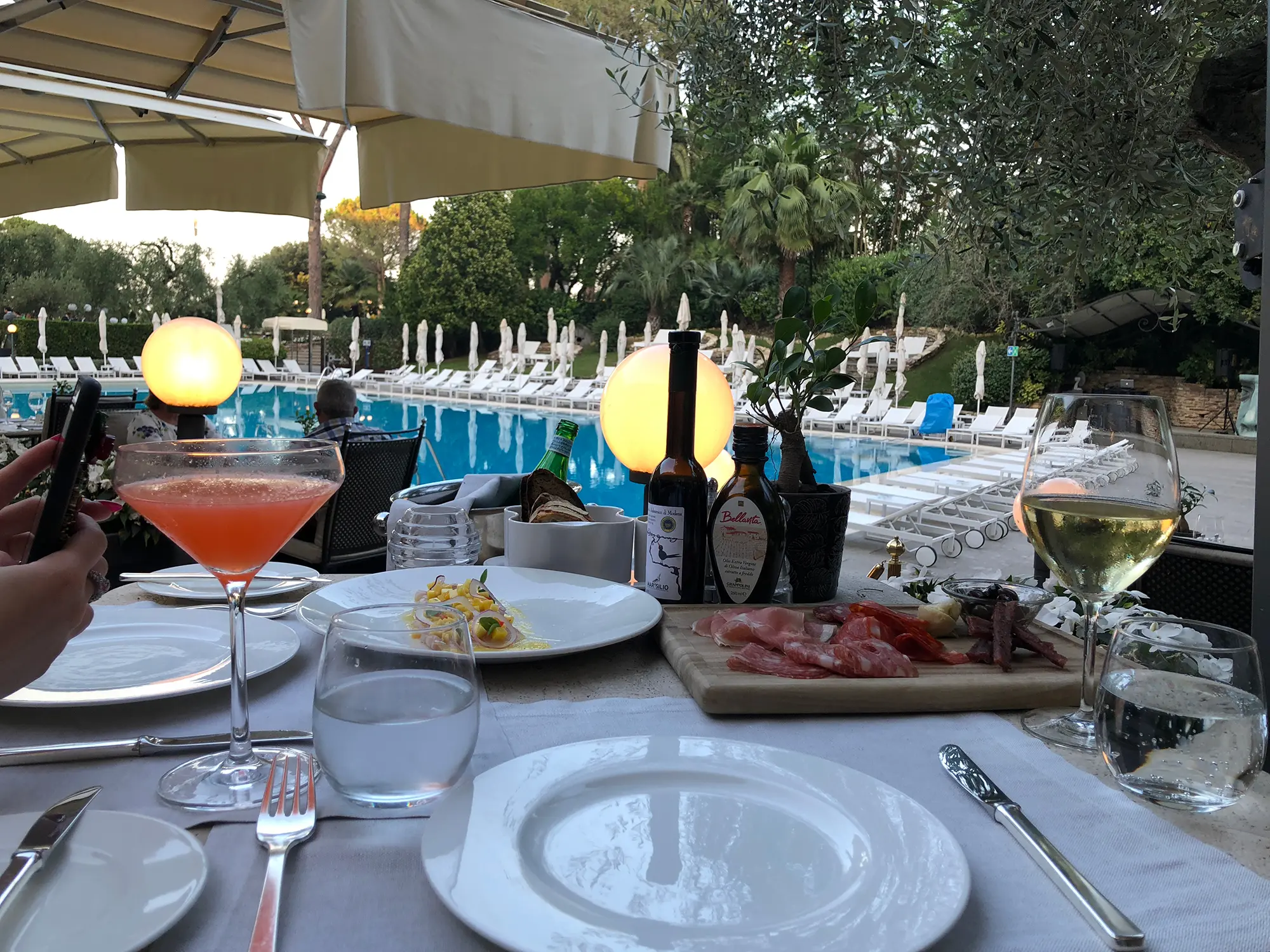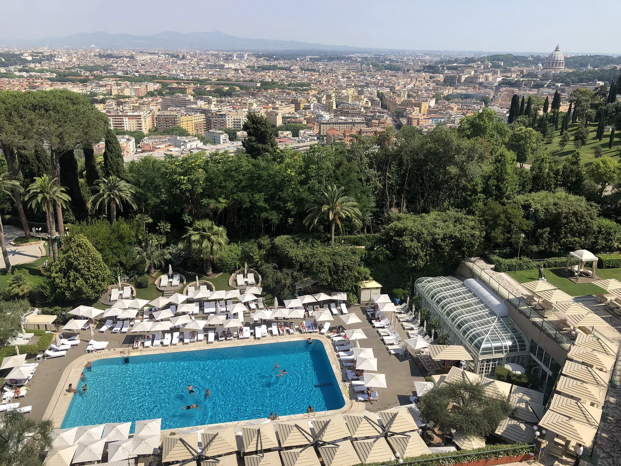 外では気持ちよさそうにプールで泳ぐ観光客の姿。プールサイドではシャンパンボトルなども販売しているので、買い物や観光を無視して早速ルクスリーな滞在を楽しむのもありでしょう。もしくは文庫を片手にSeptem Montes Romae ローマの七丘について考えにふけるのもまた一興。