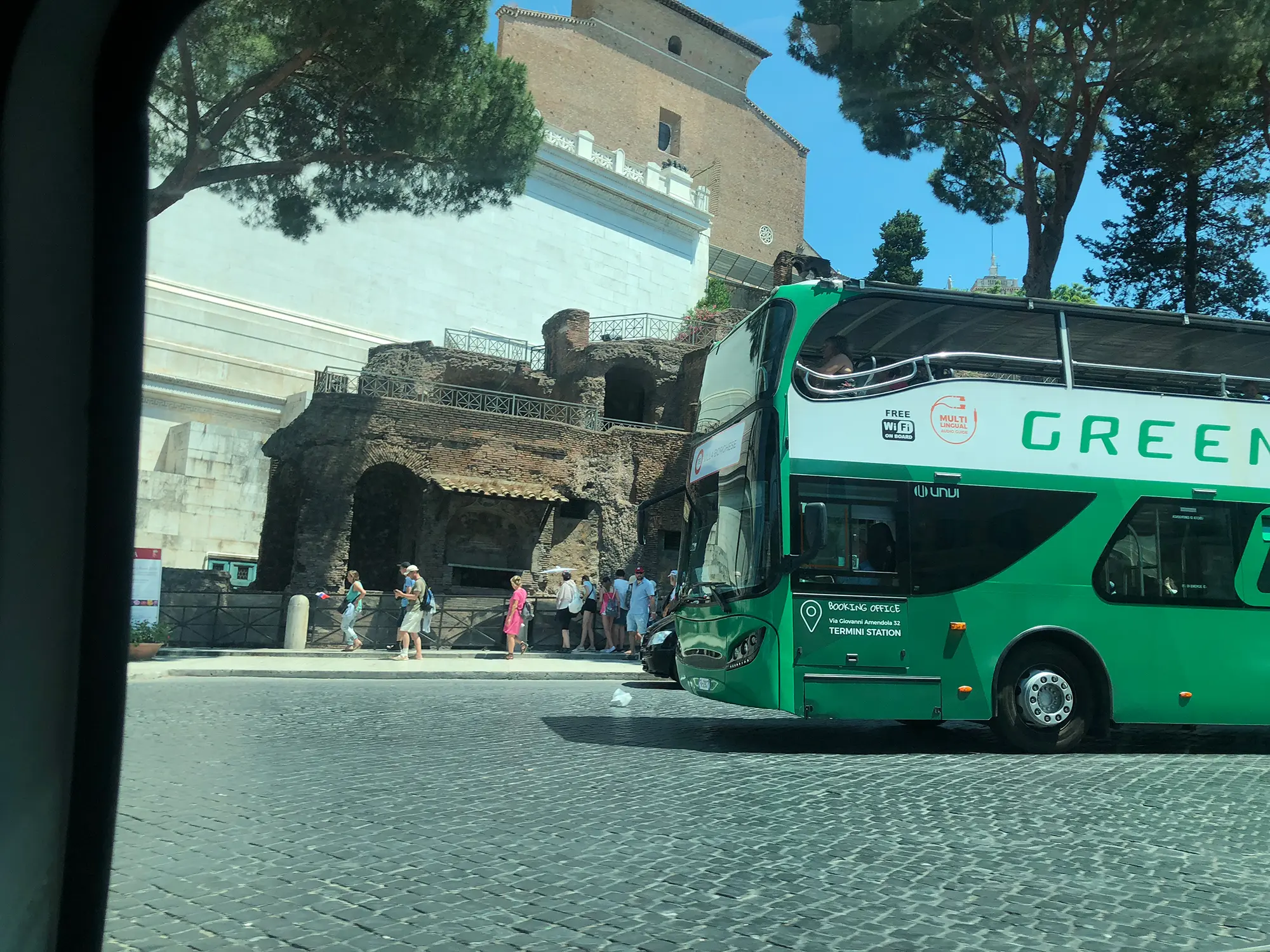 紀元2世紀に建てられた当時のアパートみたいなもので、教会の下から発見されました。四階建てになって中は広いスイートルームになっていたようです。西の建物と東の建物に分かれ、アーチ状の小道が繋がっています。まさか古代ローマ人も、二千年近く後に極東アジア人が来て車から写真を撮るとは思ってもいなかったことでしょう。