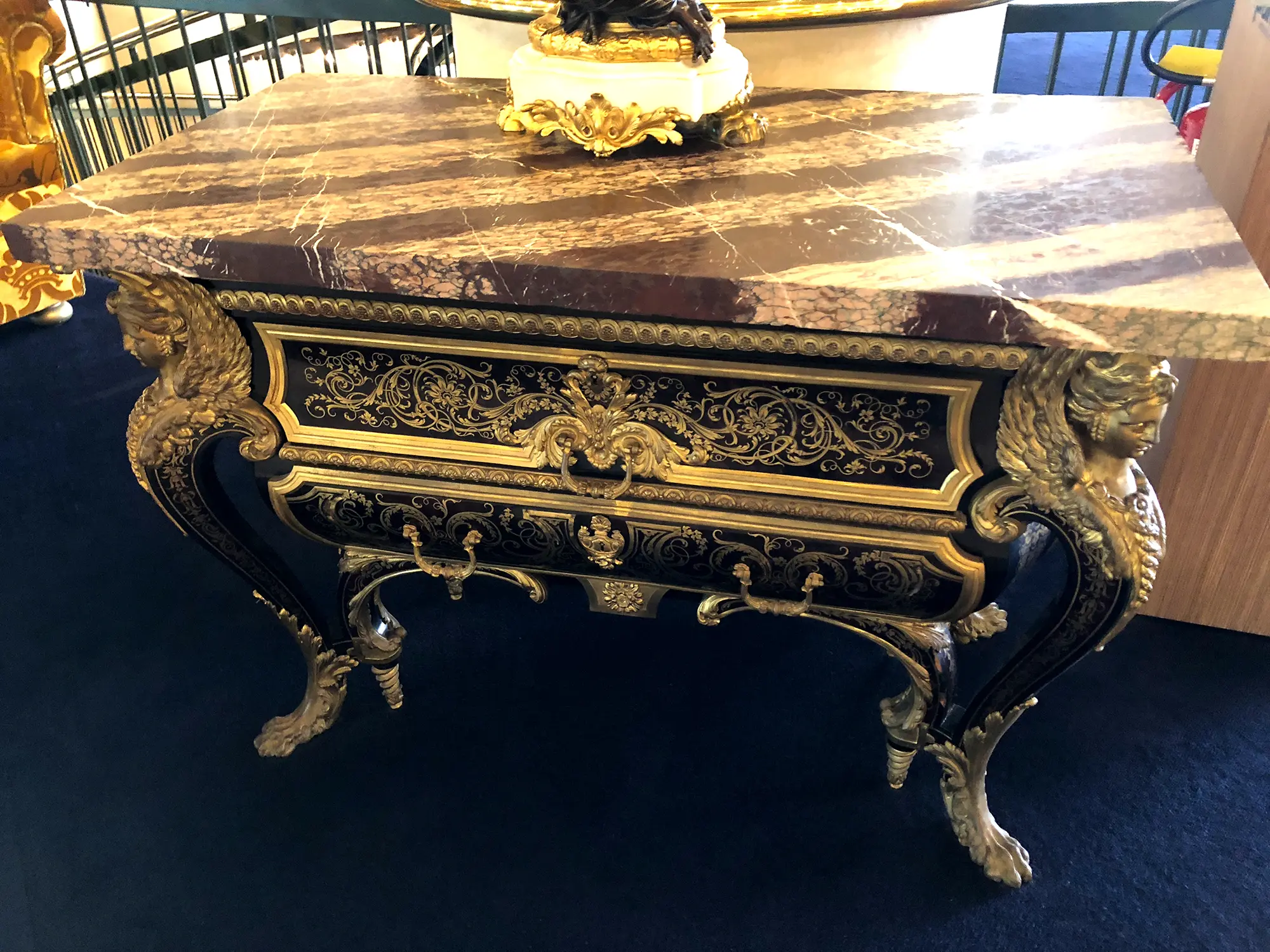 こちらも立派なチェストです。鋳物のフレームに大理石の天板、中央は突板がモザイク状に象嵌細工が歪曲して組み込まれています。信じられない技術力の高さです。この精度で作るには何年も掛かったのではないでしょうか。