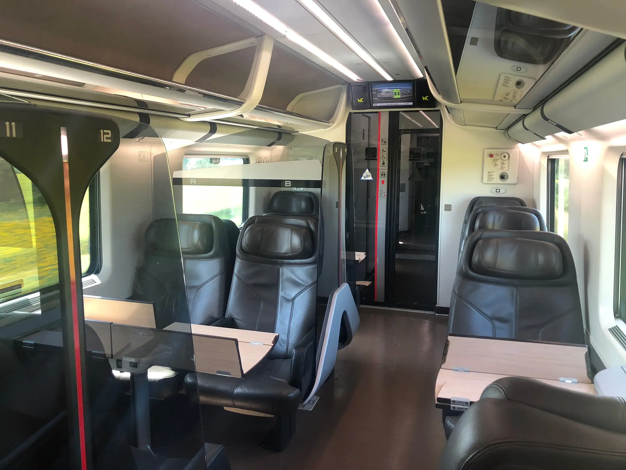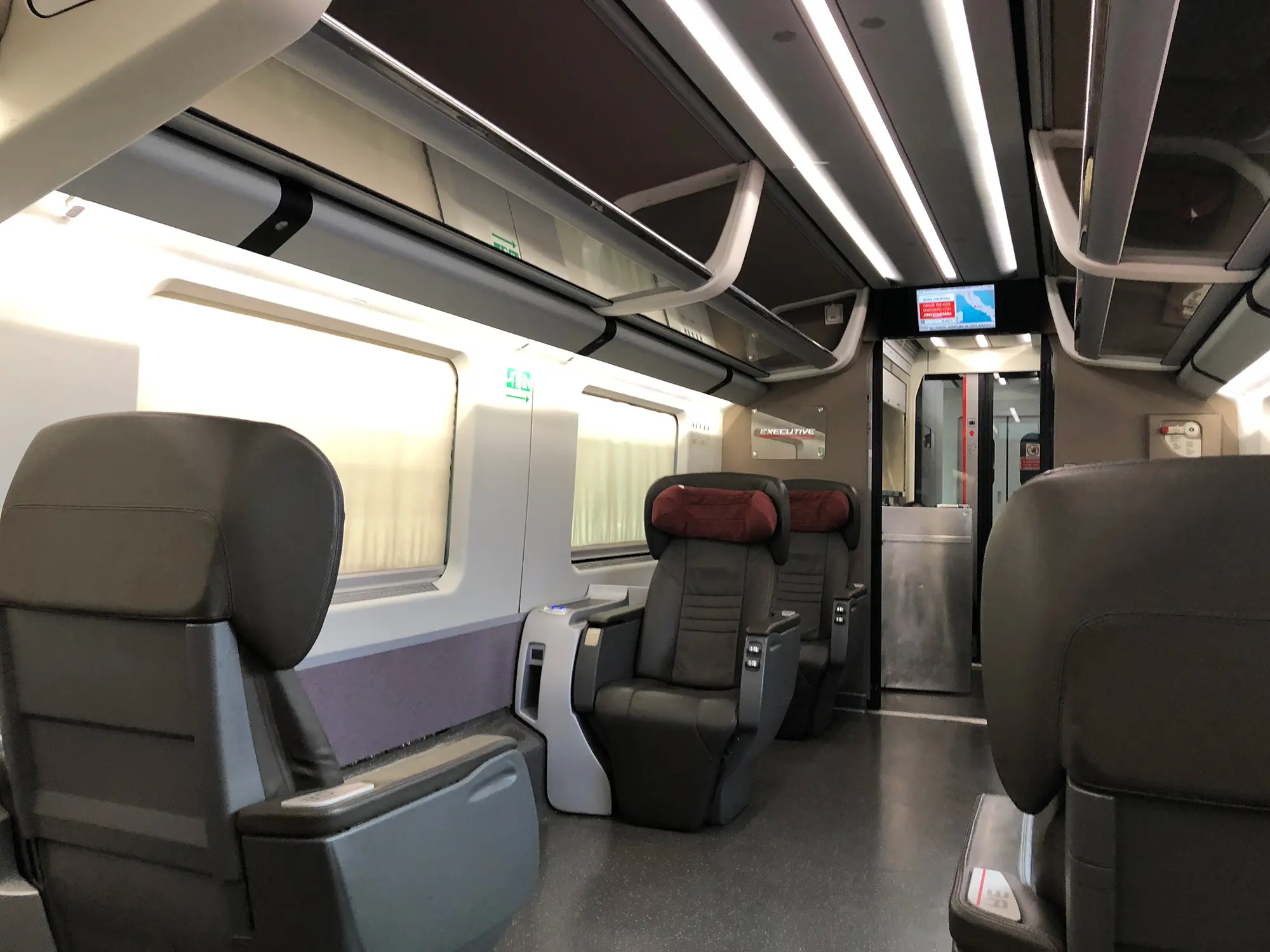 FrecciaRossa フレッチェロッサのEXECUTIVEを予約して乗車したのですが、オリエント急行の一等車とは異なり無彩色で無機質な空間です。「鉄道は乗る機械(※皮肉)」ル・コルビュジエがデザインしたのかって位に酷いデザインでした。