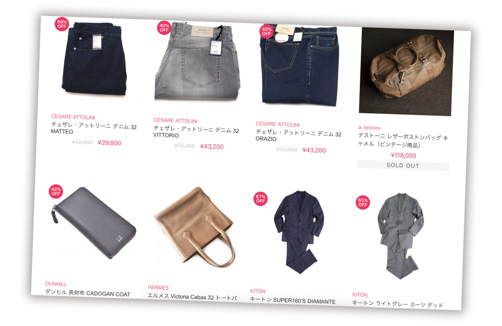 例えば上のシャツは綿の質や縫製のレベル、日本製であることなどを見ても正規店で扱っているものだと思えます。そういった場合には正規店と同じか、それに近い物を、正規店の半額や6割引きで買えることになります。