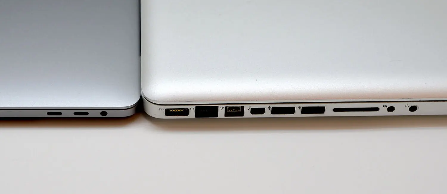 右の「MacBook Pro (15-inch, Mid 2012)」と比べると驚くほどにスマートになっています。大学生がスターバックスで自慢するのであれば、これほど美しいガジェットは無いのですが大人が仕事をするのであれば、残念ながら2019年も有線LANで大容量ファイルを急いでアップロードしたり、USB-Aにプリンターを接続して印刷したりすることでしょう。